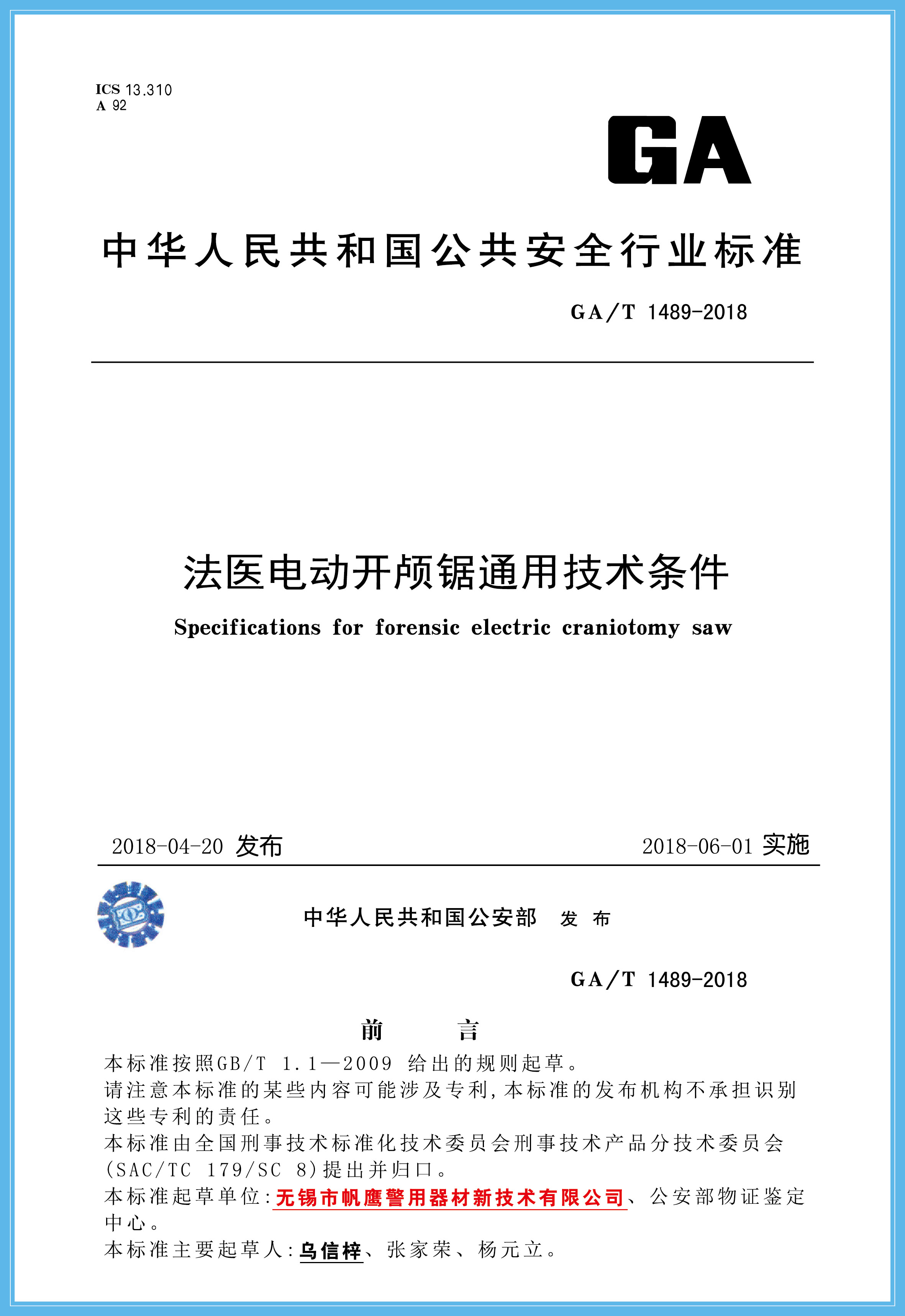無錫市帆鷹警用器材新技術(shù)有限公司起草了11項行業(yè)標(biāo)準(zhǔn),目前公安部已審核通過10項,此次通過的3項為2018年度公安部新列標(biāo)準(zhǔn),已報國家質(zhì)量監(jiān)督檢驗檢疫總局備案,通過的3項標(biāo)準(zhǔn)為:法醫(yī)科學(xué)槍彈測速儀通用技術(shù)條件(GA/T 1488-2018)、法醫(yī)電動開顱鋸?fù)ㄓ眉夹g(shù)條件(GA/T 1489-2018)、法醫(yī)科學(xué)危險槍支射擊架通用技術(shù)條件,現(xiàn)特予以公告。